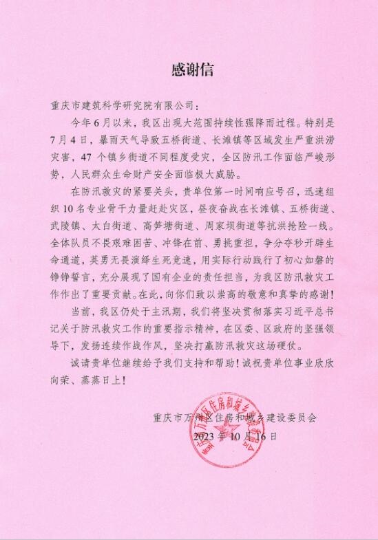 近日,重慶市建筑科學(xué)研究院有限公司收到來(lái)自重慶市萬(wàn)州區(qū)住房和城鄉(xiāng)建設(shè)委員會(huì)的感謝信,信中對(duì)市建科院在今年7月萬(wàn)州暴雨災(zāi)后防汛救災(zāi)工作中所做出的貢獻(xiàn)致以敬意和感謝。