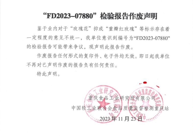 鑒于業(yè)內(nèi)對于“玫瑰花”抑或“重瓣紅玫瑰”等標(biāo)示存在著一定程度的意見不統(tǒng)一,我單位意識到編號為“FD2023-07880”的檢驗(yàn)報(bào)告可能帶來爭議,現(xiàn)聲明此報(bào)告作廢。