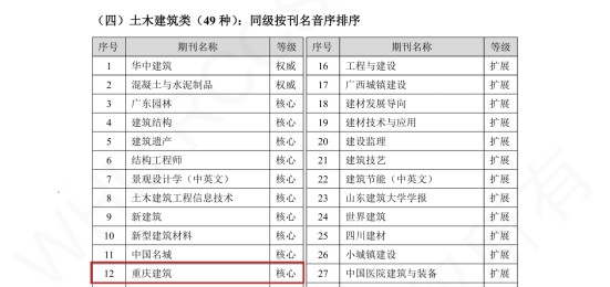 《報告》顯示,首次發布的評價結果中,“土木建筑類”應用型期刊合計49本,其中2本“權威”,10本“核心”。《重慶建筑》入選“核心”期刊,按音序排第12位。