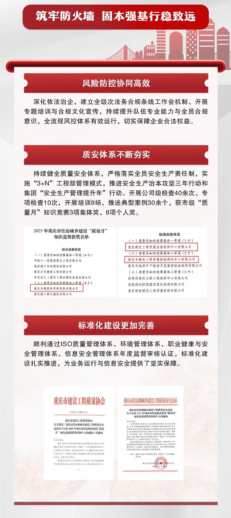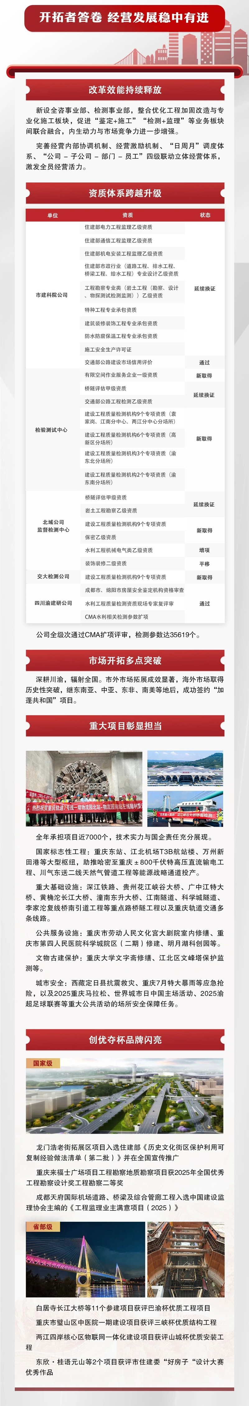 2025年,重慶設計集團市建科院內部融合持續深化,業務布局不斷完善,核心能力穩步增強,風險防線更加牢固,黨建與業務同頻共振,發展基礎堅實穩固。