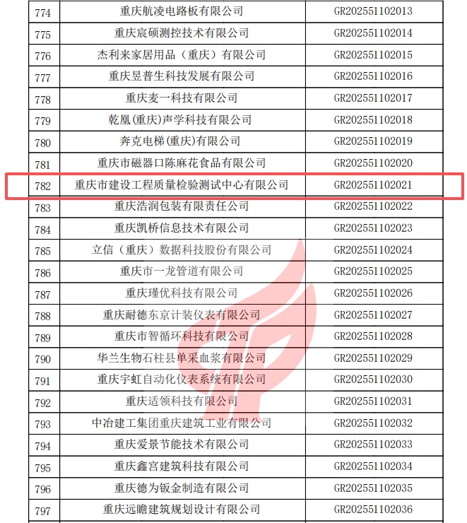 近日,全國高新技術企業認定管理工作領導小組辦公室正式發布《對重慶市認定機構2025年認定報備的第二批高新技術企業進行備案的公告》,重慶設計集團市建科院所屬子企業重慶市建設工程質量檢驗測試中心有限公司,獲評“國家高新技術企業”。